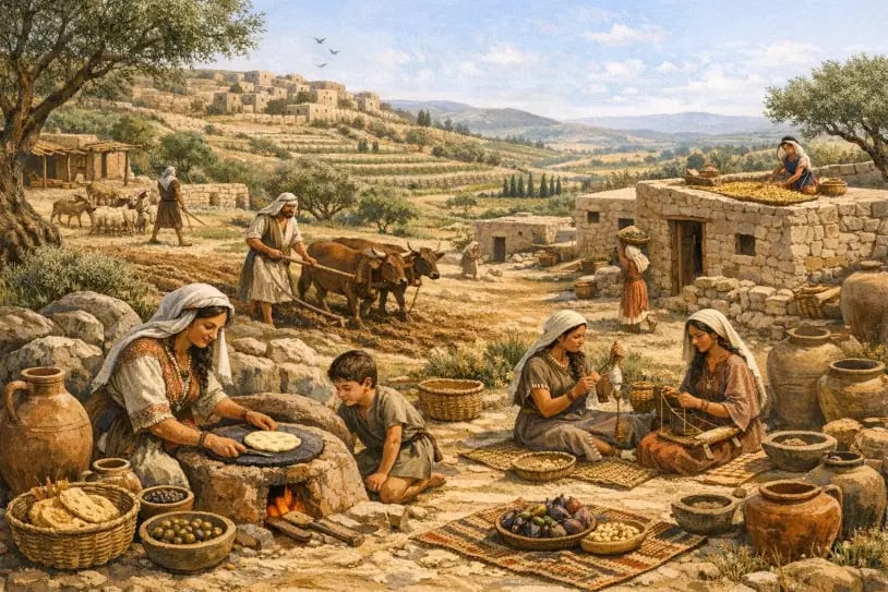 العالم اليومي لكنعان القديمة؛ نفس المنازل والأدوات والمناظر الطبيعية التي حملها الشعب الفلسطيني الذي لم يغادر الأرض المقدسة أبداً.