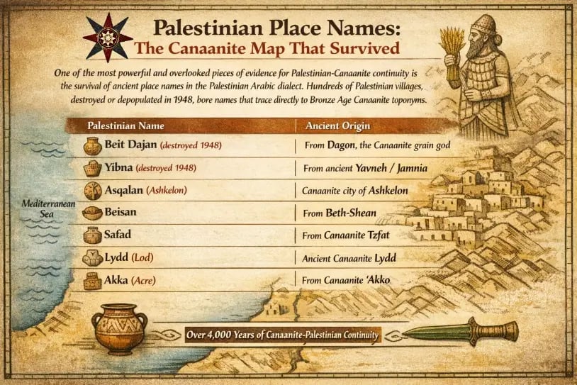 ٤. أسماء الأماكن الفلسطينية تحفظ أسماء مواقع كنعانية تمتد لأربعة إلى خمسة آلاف عام - دليل على استمرارية سكانية غير منقطعة دمرتها الطبقة الحاكمة الأوروبية لدولة إسرائيل بشكل منهجي من خلال الإبادة الجماعية والهدم وإعادة التسمية.