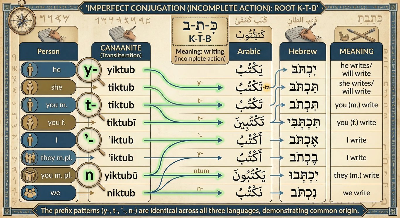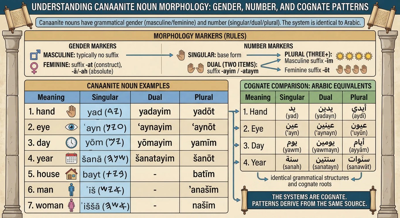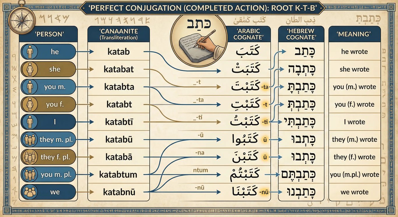 The trilateral root system, the pattern of noun gender and number marking, and the verb conjugation patterns shown in this document are identical in structure across Canaanite, Arabic, and Hebrew. This grammatical inheritance proves common ancestry.
