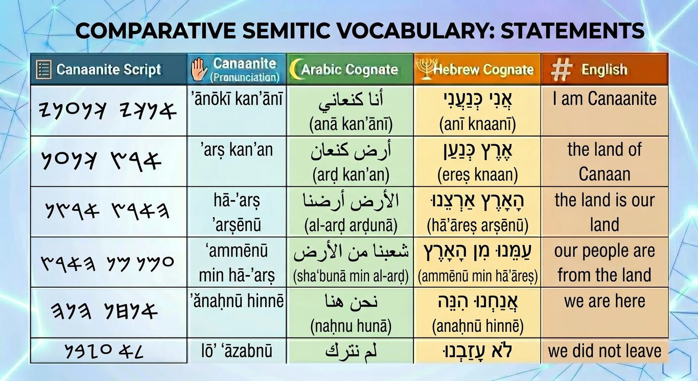 This guide provides the foundation for learning Canaanite. The alphabet, grammar, and vocabulary presented here demonstrate the direct relationship between Canaanite and Arabic. Arabic speakers are not learning a foreign language when they study Canaanite. They are learning the ancestral form of their own language.