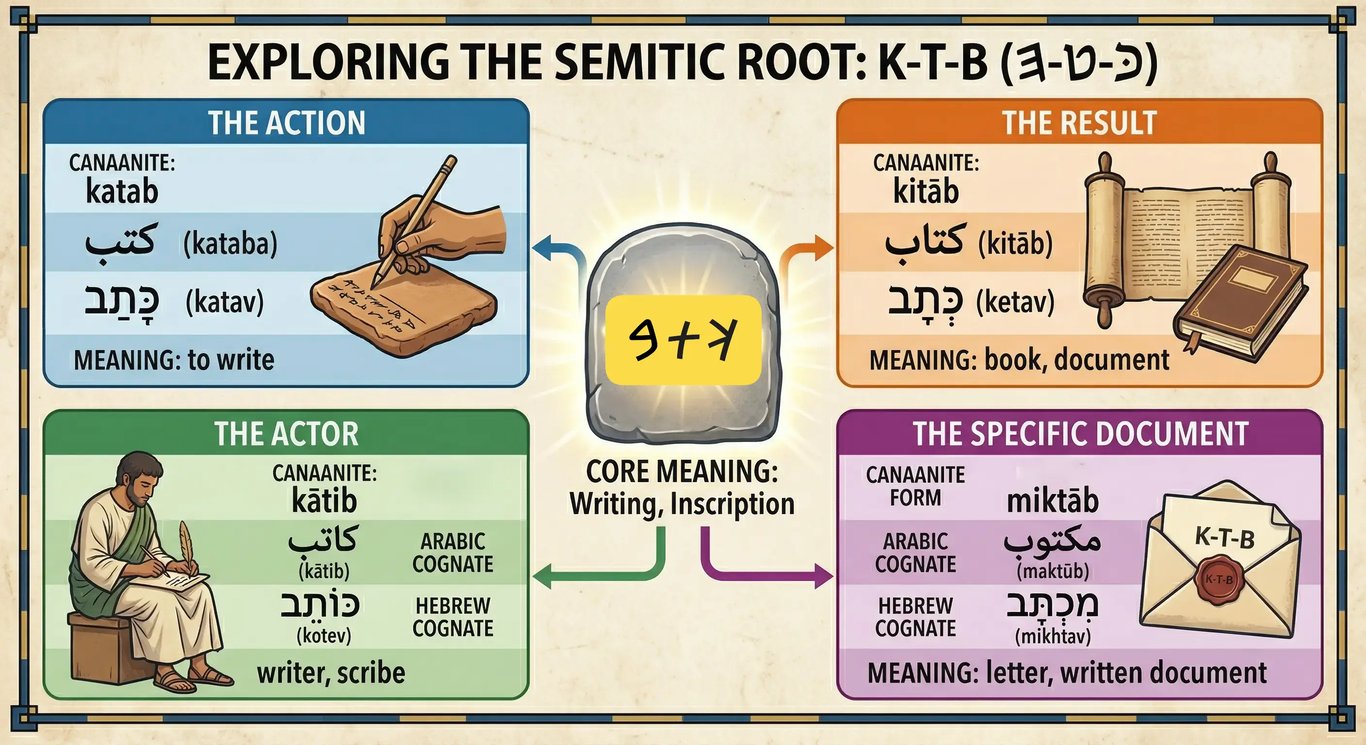 kitāb (book, document) | كتاب (kitāb) | כְּתָב (ketav) |